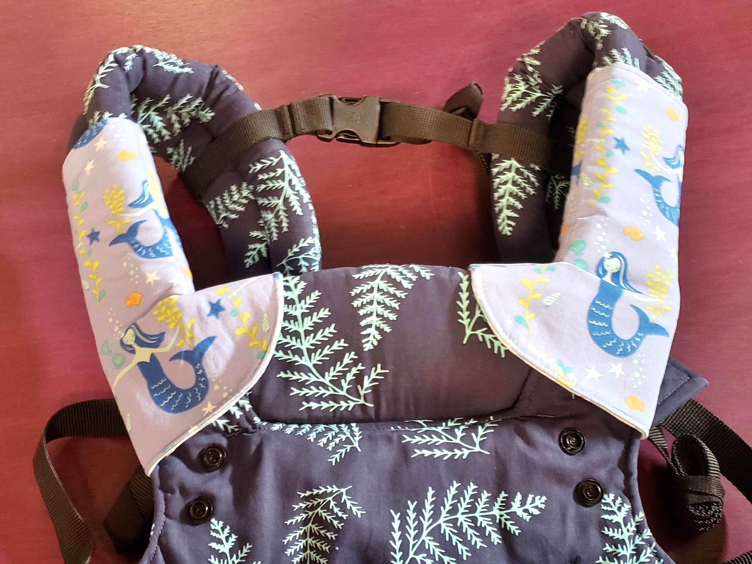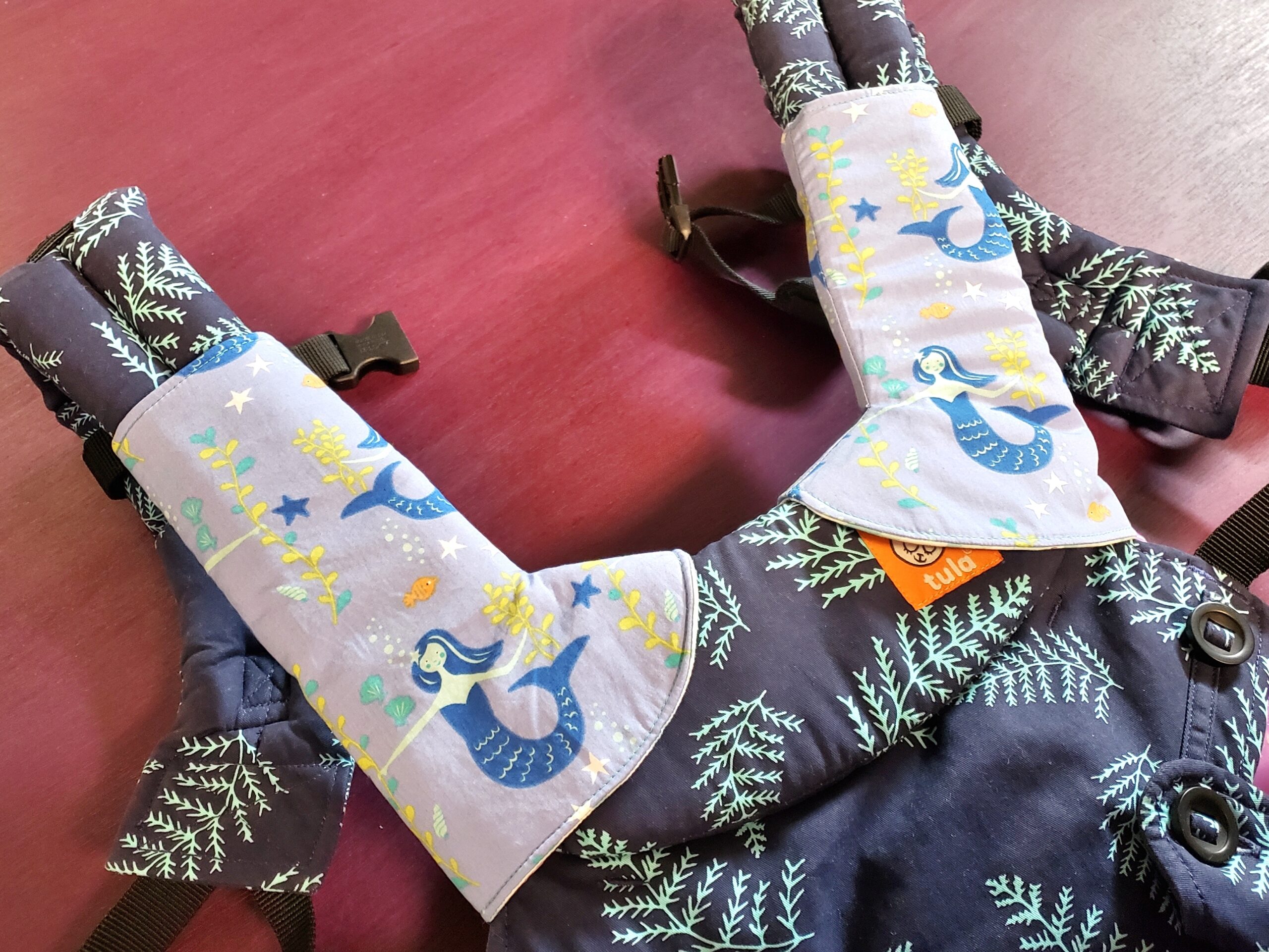 The drool pads made of three layers and are reversible. You can pick two great fabrics that match or coordinate with your carrier, or just pick fun fabrics you love! You can also choose to use PUL or other waterproof fabric inside or as the backing for ultimate carrier protection from that super drooler.